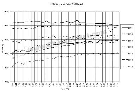 下面简单地探讨效率问题。以下讨论参见图8。可以看到,电路一般在较低的输入电压和较重的负载时效率最高。在所有工作情况下,总的效率不会低于75%。
